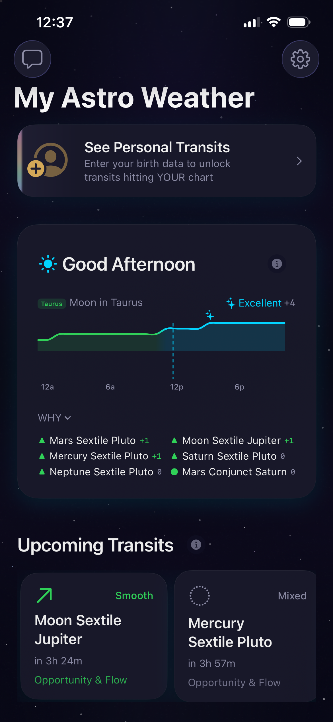 A morning brief every day tells you what today actually feels like before you live it. Not generic vibes. Specific read-outs: the Moon just moved into Taurus, so the afternoon will feel slower and more grounded. Venus just squared Mars and you'll feel it in how conversations land. A Full Moon is perfecting at 11:47pm tonight in Scorpio. You check the energy the way you'd check whether to bring an umbrella.
