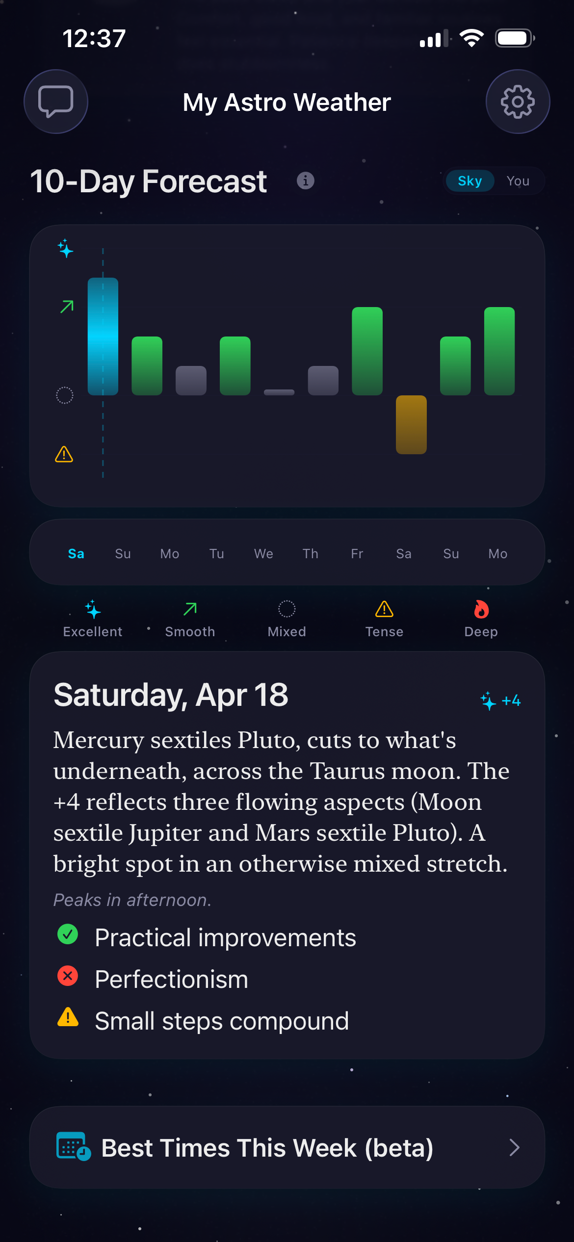 The 10-day energy forecast gives every day a score. Tap any bar and read what that day holds. Plan a hard conversation for the day with softer energy. Launch on the day with the flow. Give yourself grace on the day that's heavier. Notifications arrive the moment the sky actually shifts: Moon sign changes, Mercury stationing retrograde, major aspects perfecting, void-of-course windows opening and closing.
