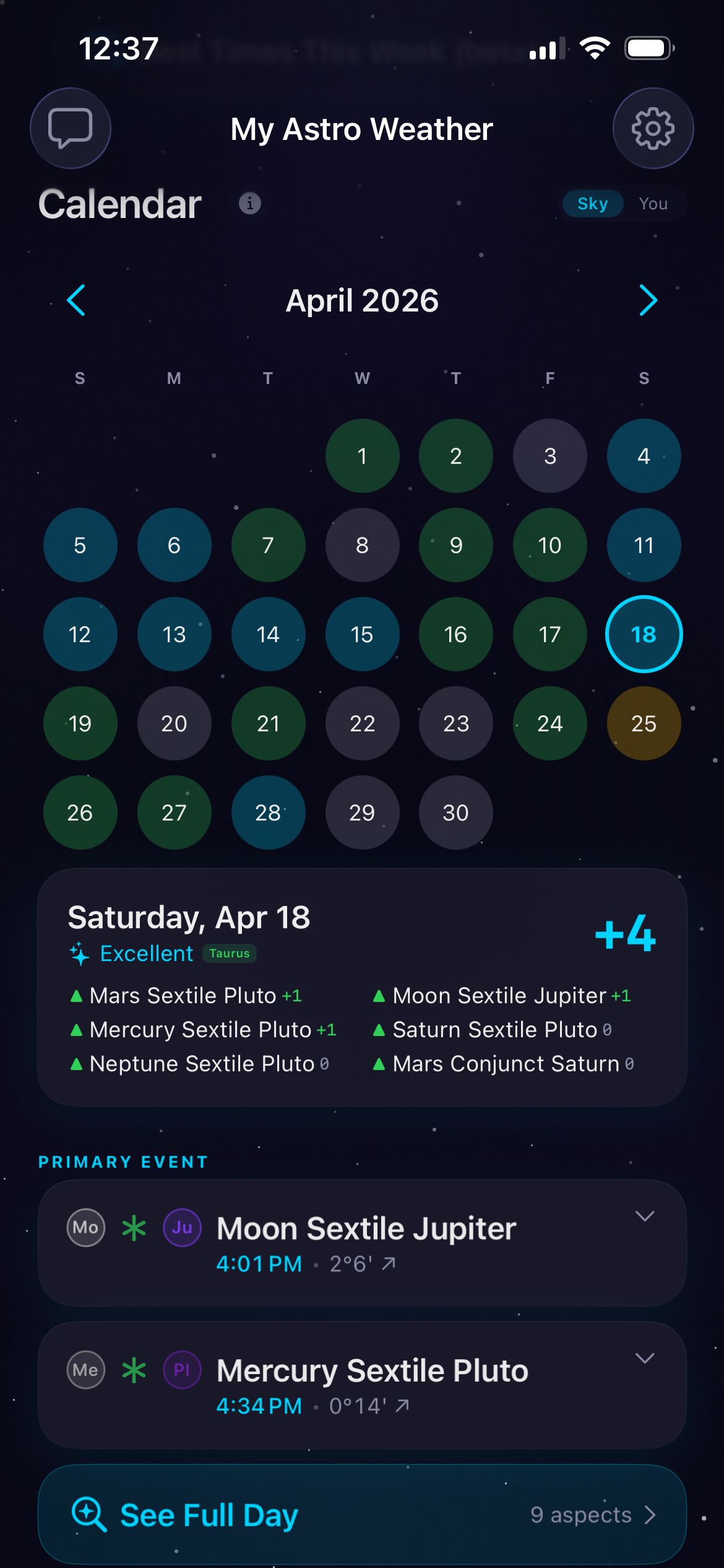 My Astro Weather is an iOS app that presents astrology the way Apple's Weather app presents the forecast. Instead of a daily horoscope based on your sun sign, you see the real sky: every planet's exact position, every aspect forming between them, every Moon sign change, every void-of-course window, every retrograde station. All of it updated live, timed to the minute, interpreted in plain, human language.