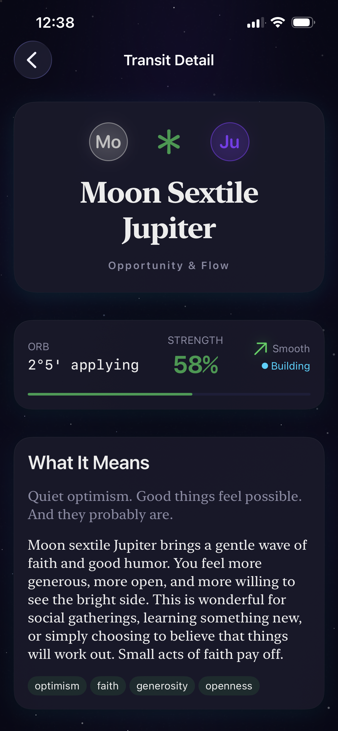 Check the energy like you check the weather. Real planetary positions updated live. Real Moon tracking to the minute. Plain-language notes on what today actually feels like, before you live it.