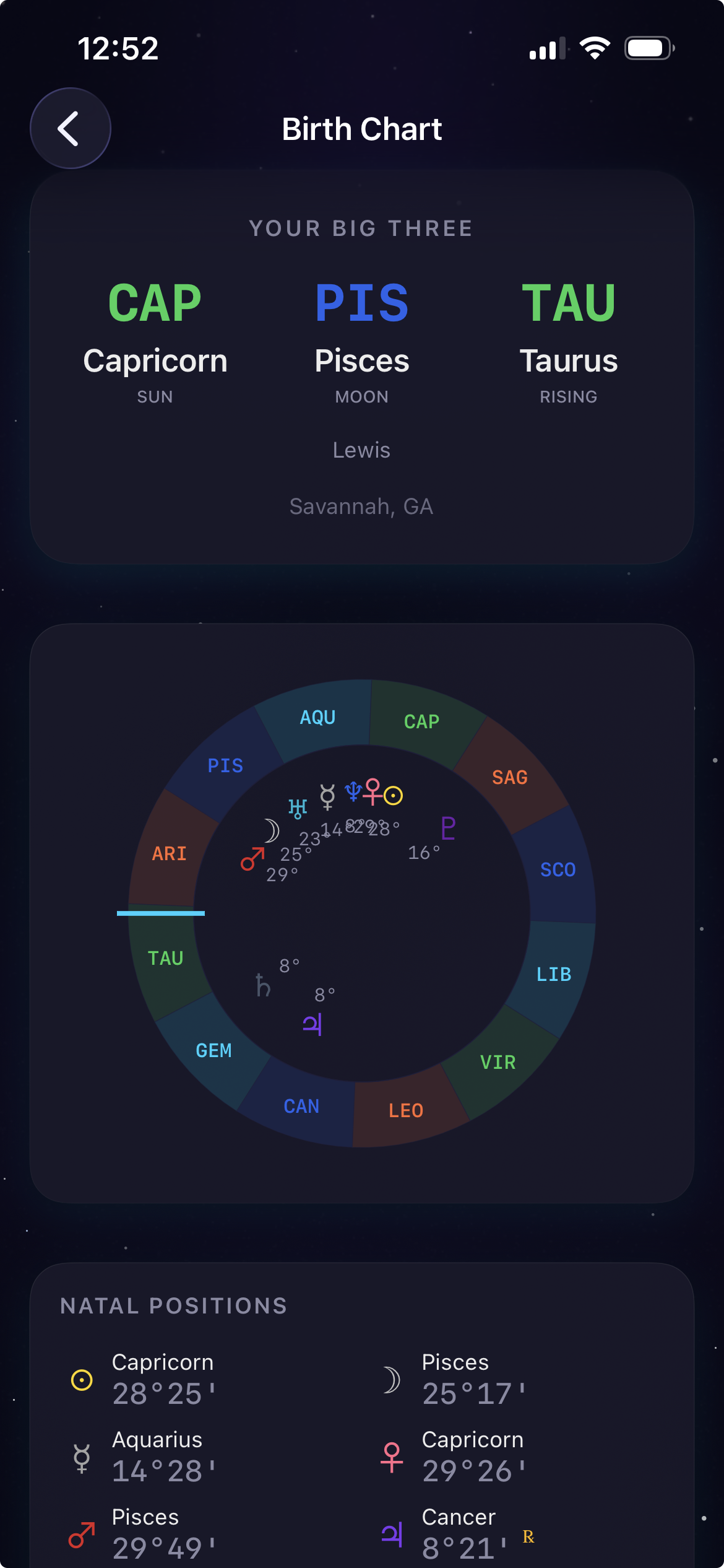 - Full birth chart (Sun, Moon, Rising, Ascendant, houses, natal aspects)